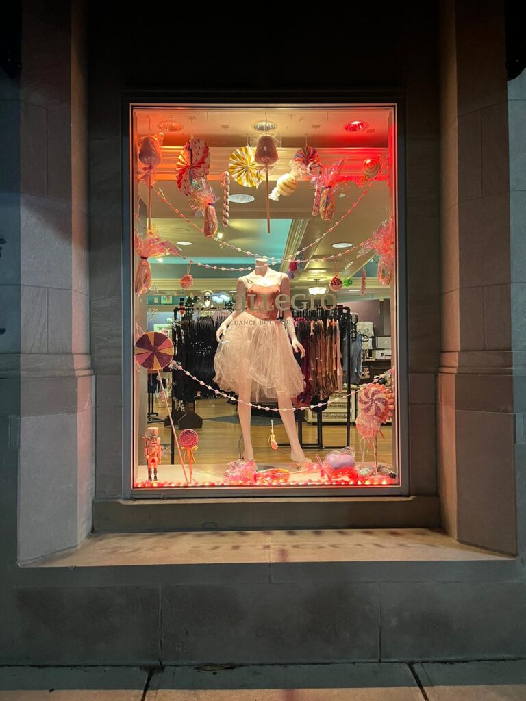 The same goes for the Christmas season, and using the Nutcracker as a theme is a natural choice for many dance retailers. “December is all about the Nutcracker,” Keys-Magaña says. “Recently I have been picking different scenes from the ballet and decorating from that.” One year, her store highlighted the “Snow” scene and covered the windows in snowflakes made from paper and spray, and used fake snow on the mirrors. Last year, they took inspiration from the “Land of Sweets” section of the ballet, which meant decorating mirrors as gingerbread houses and transforming windows into a candyland.