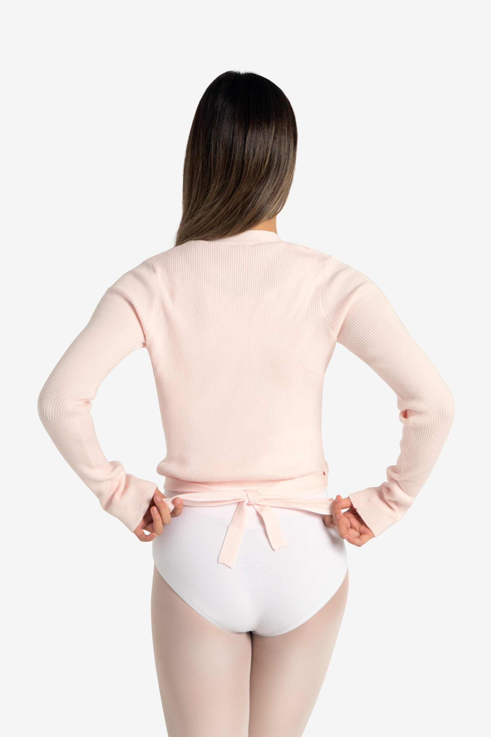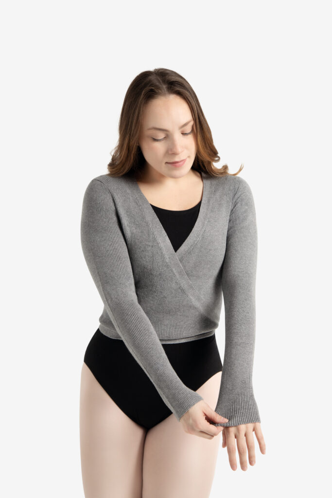 Eurotard’s long-sleeve cotton/Lycra ballet-wrap sweater for women features adjustable ties for a secure fit—ideal for layering in the studio or as a stylish cover-up on the way to class. Image courtesy of Eurotard.